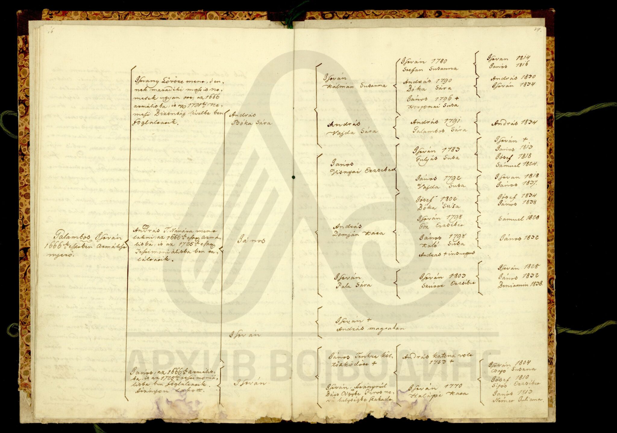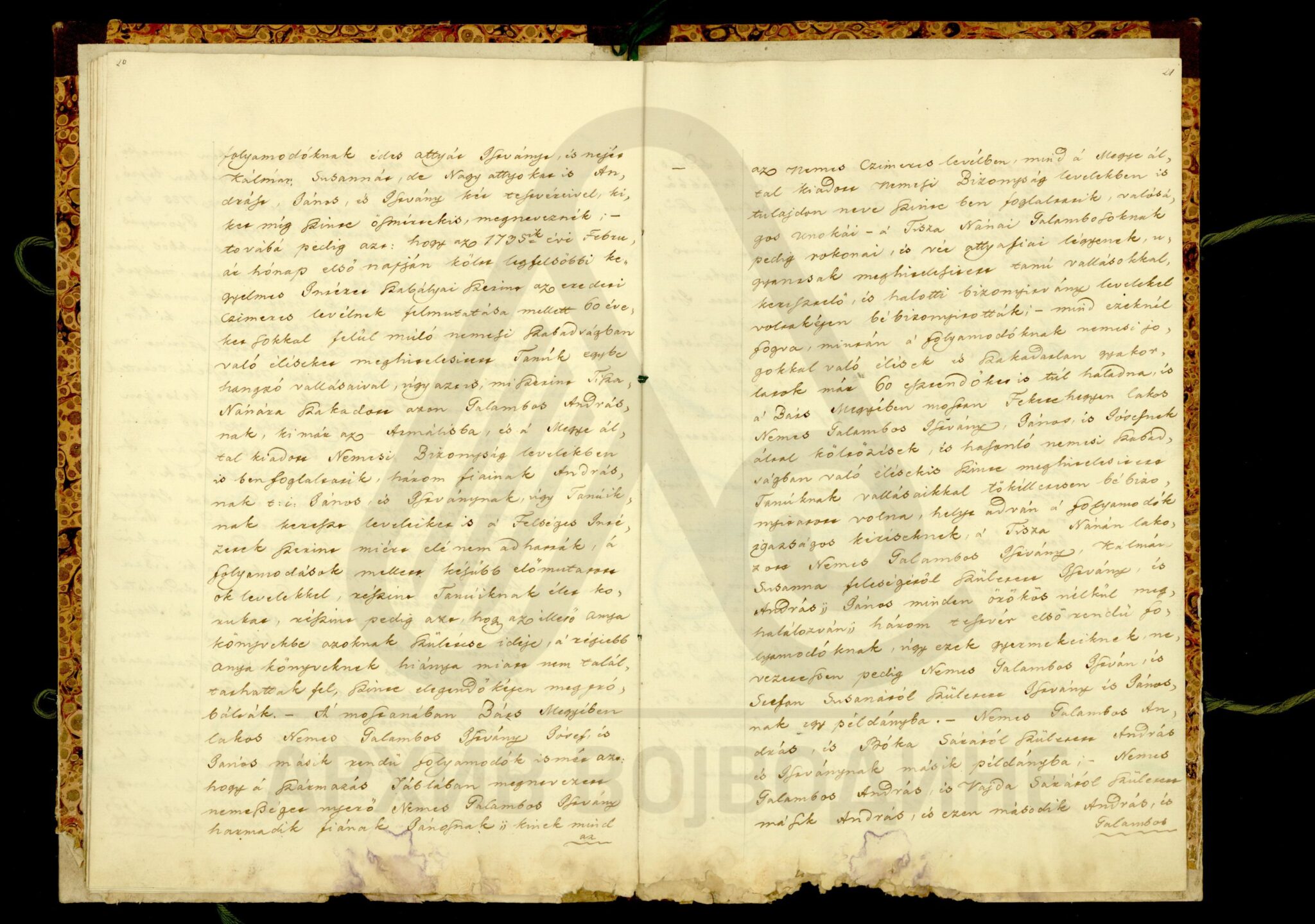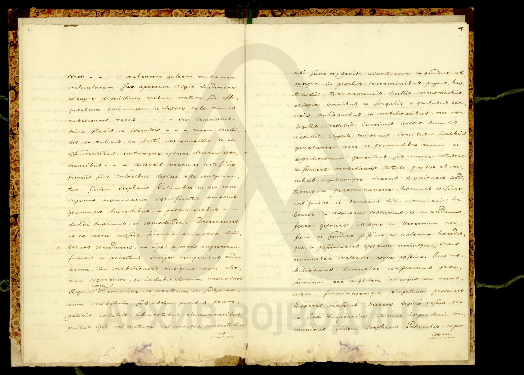 Хартија, мађарски, латински језик, 12 листова, рукопис (облик књиге тврдог повеза), оштећена, папирни печат. Потврда жупаније Хевеш и Килше Солнок (Heves és Külsö Szolnok; Heves, et exterioris Szolnok unitorum) о племићком пореклу породице Галамбош (Galambos), чијим прецима је цар Леополд I даровао племићку титулу 26. маја 1666. године. Потврда садржи родослов именоване породице, чији потомци живе у месту Тиса-Нана (Tisza Nánai) на територији наведене Жупаније, као и у местима Фекетић (Feketehegyi) и Пирош (Piros; Руменка) у Бачко-бодрошкој жупанији.